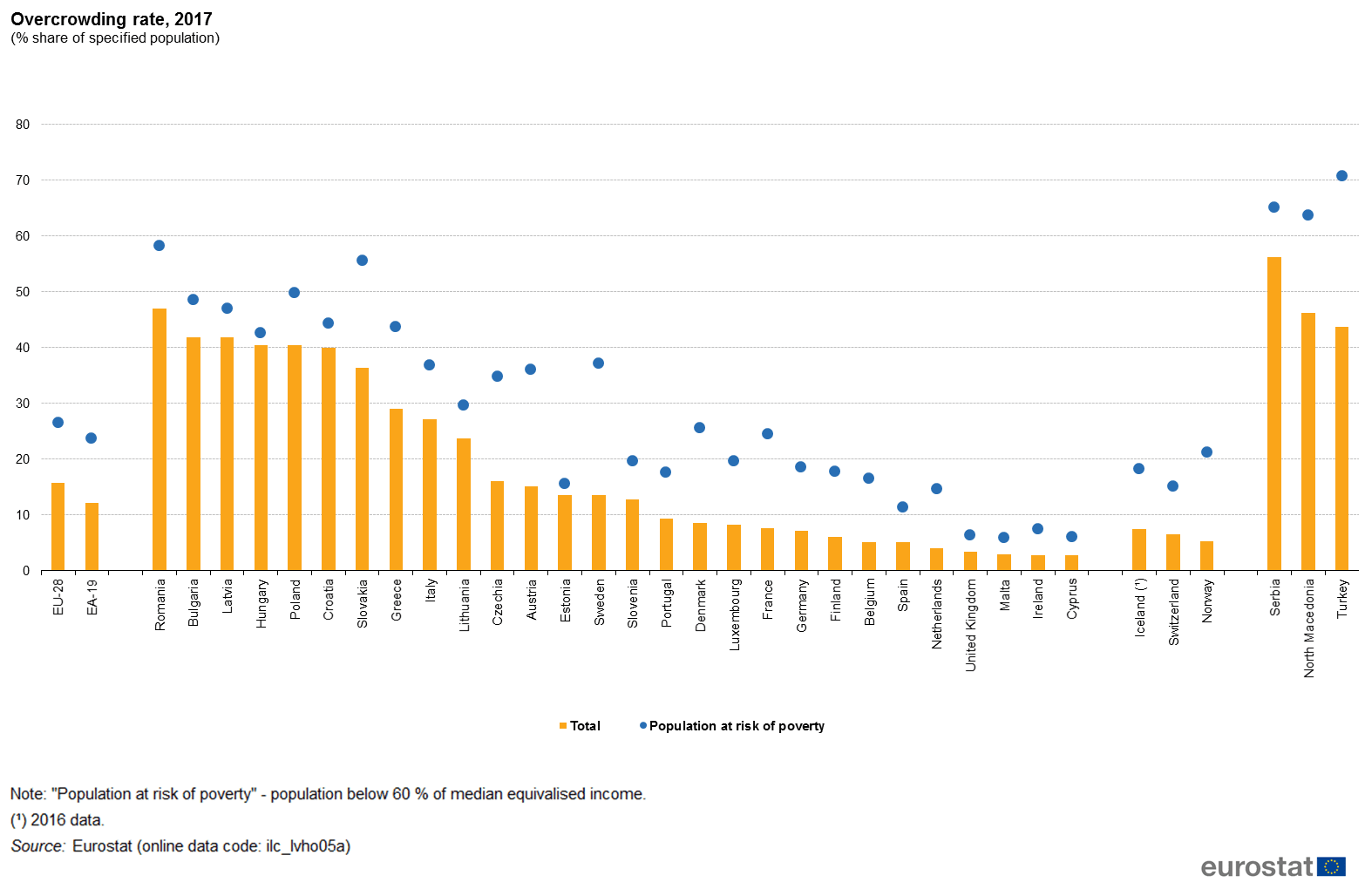 În 2017, majoritatea populației din fiecare stat membru al UE locuia în locuințe proprietate personală, între 51,4 % în Germania și 96,8 % în România. În 2017, peste 15 % din populația UE locuia în locuințe supraaglomerate; cea mai mare rată dintre statele membre s-a înregistrat în România (47,0 %).